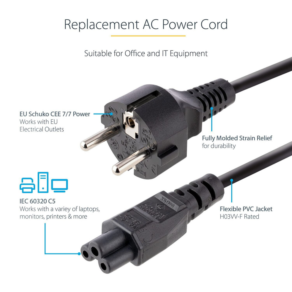 - AC POWER CABLE: This 3m (9.8ft) 18AWG (0.75mm) flexible laptop power cord with an EU Schuko Plug and an IEC 60320 C5 connectors is suitable for power bricks featuring a C6 inlet Workstation/home office use Rated to carry 250V at 2.5A