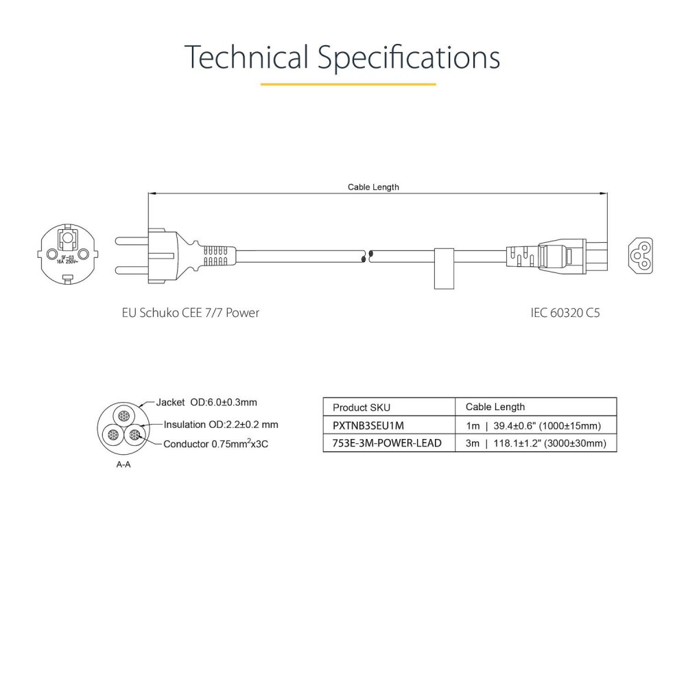 - SPECS: 3m (9.8ft) Power Cable EU Schuko Plug to IEC 60320 C5 18AWG (0.75mm) 250V 2.5A (Max) Jacket