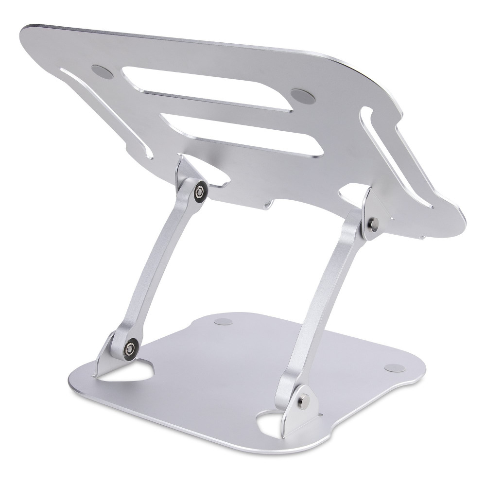 - Silver laptop holder for desk lifts and tilts your laptop to eye level for ergonomic comfort and increased productivity
