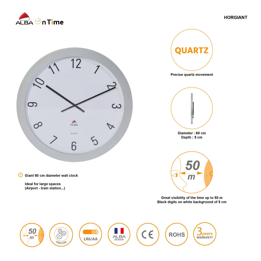 Alba Horgiant Wall Clock 600cm Diameter Silver Grey - HORGIANT