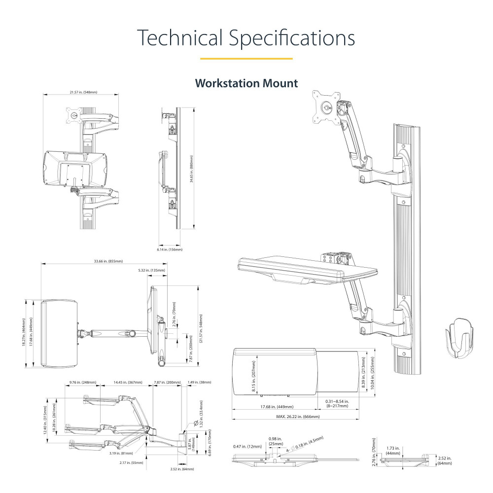 - RANGE OF MOTION: Monitor arm features +90/-20° tilt, +/-90° swivel, 360° rotation; Keyboard Tray +90/- 20° tilt; Full-motion arms w/ height range of 12.4in (31.5cm); Monitor arm extends 24.1in (61.3cm) & keyboard tray 33.5in (85.3cm) from wall