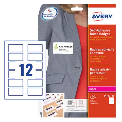Avery Self Adhesive Name Badge Labels 75x40mm White (Pack 20) L4782-20