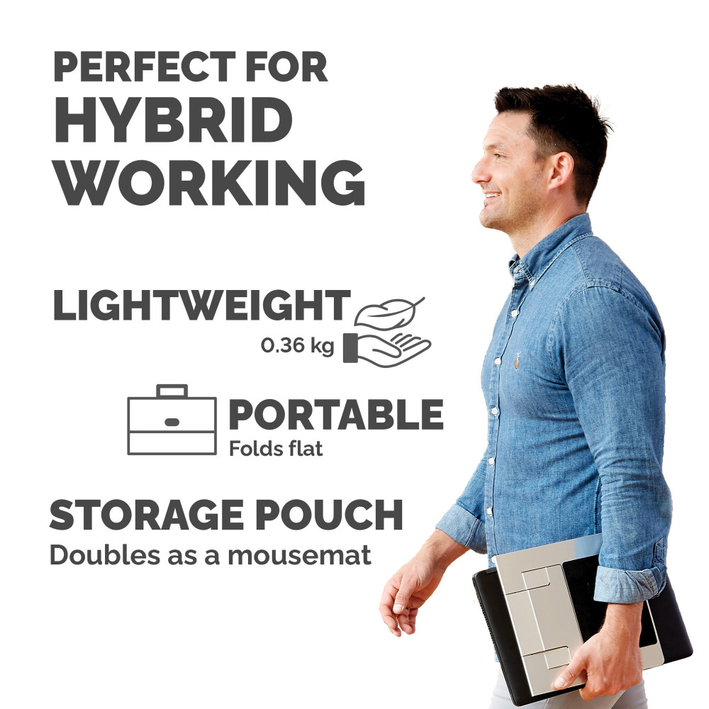 - Folds fully flat and comes with storage pouch that can be used as a mouse mat, perfect for agile working