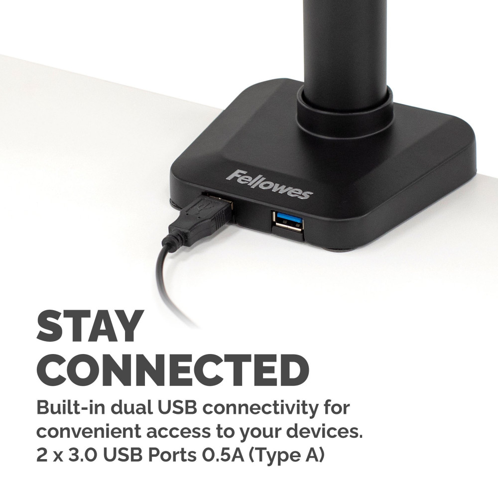 - BUILT-IN USB PORTS - Built in dual USB connectivity and intuitive cable management allows you to stay connected and minimise clutter at the same time with the Fellowes Platinum Series dual stacking monitor arm