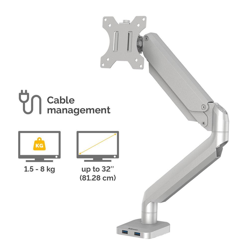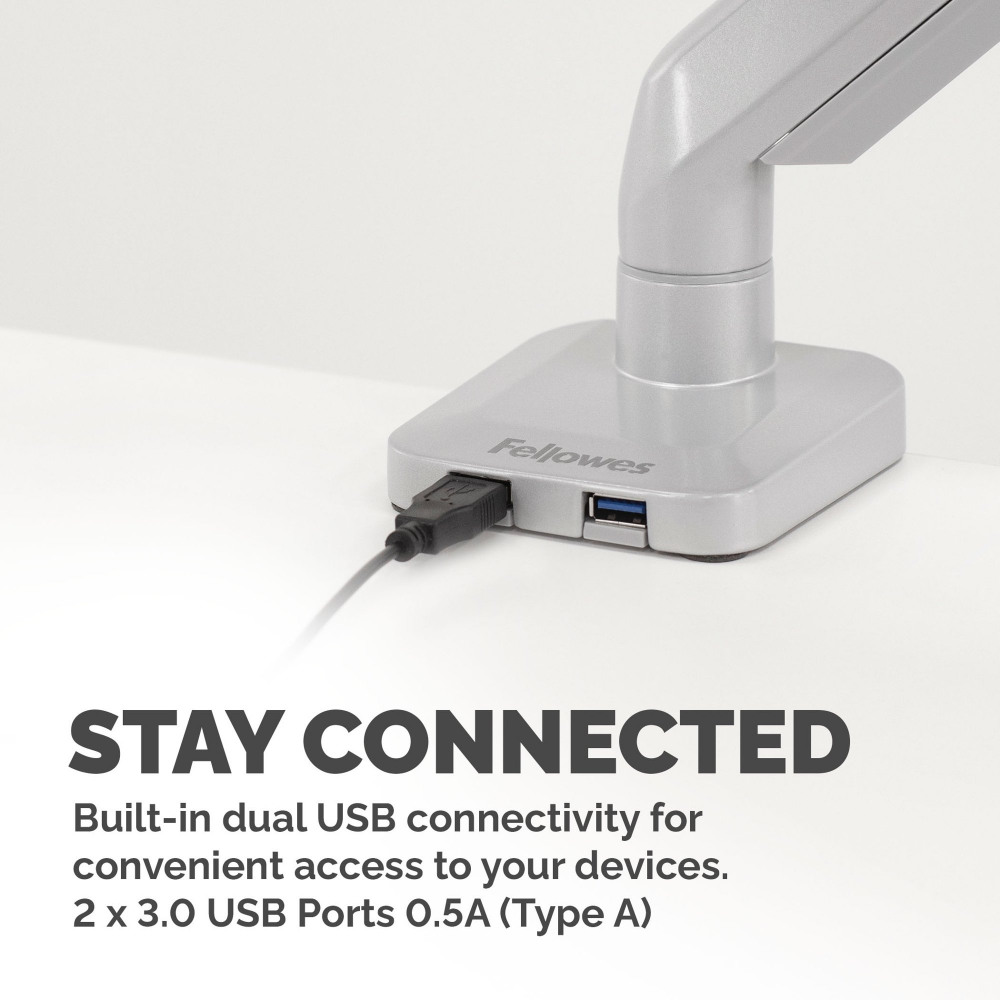 - BUILT-IN USB PORTS - Built in dual USB connectivity and intuitive cable management allows you to stay connected and minimise clutter at the same time with the Fellowes Platinum Series monitor arm