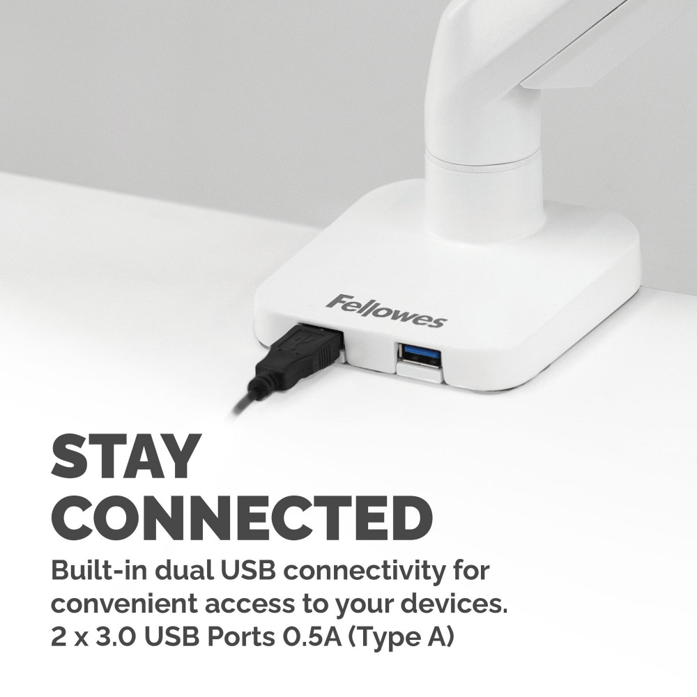 - BUILT-IN USB PORTS - Built in dual USB connectivity and intuitive cable management allows you to stay connected and minimise clutter at the same time with the Fellowes Platinum Series monitor arm