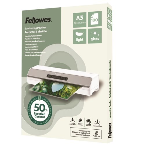 Fellowes Recycled Laminating Pouches Gloss A3 Light Duty 2x75micron (Pack 100) 100142988