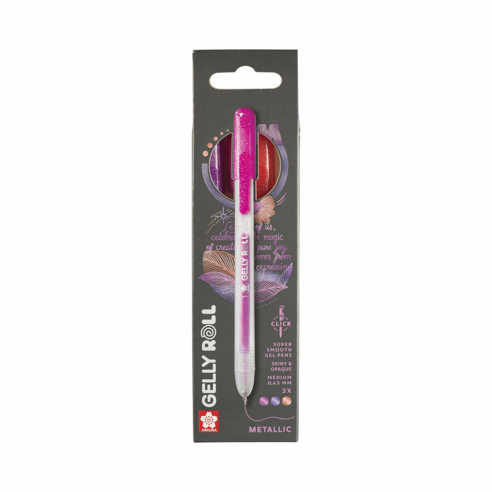 - This set consists of 3 retractable gel pens with metallic red, pink and purple ink