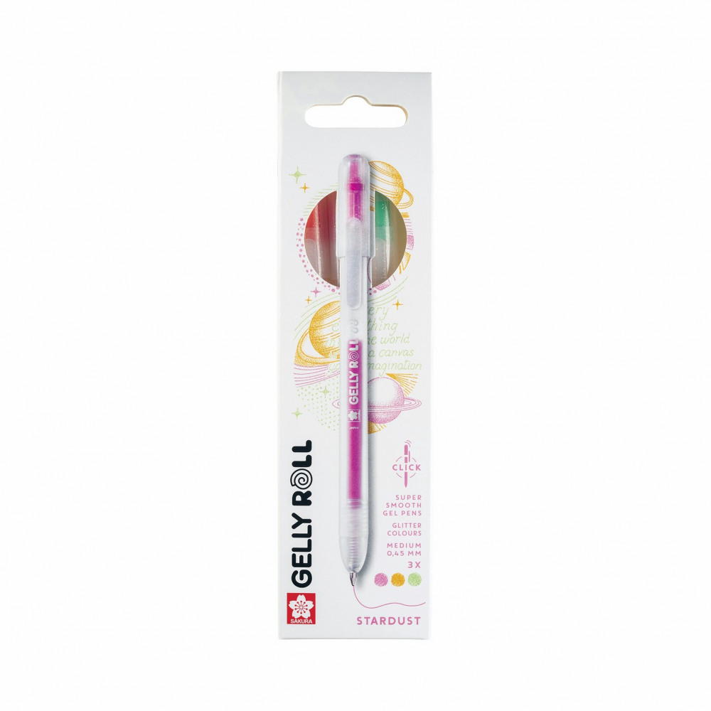 - This set consists of 3 retractable gel pens with glittering stardust orange, rose and emerald ink