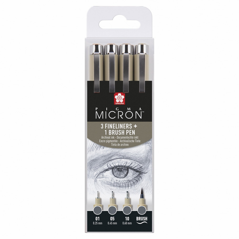 - Contains: 1x 01 (0.25 mm), 1x 05 (0.45 mm), 1x 10 (0.60 mm) and 1x Pigma Brush
