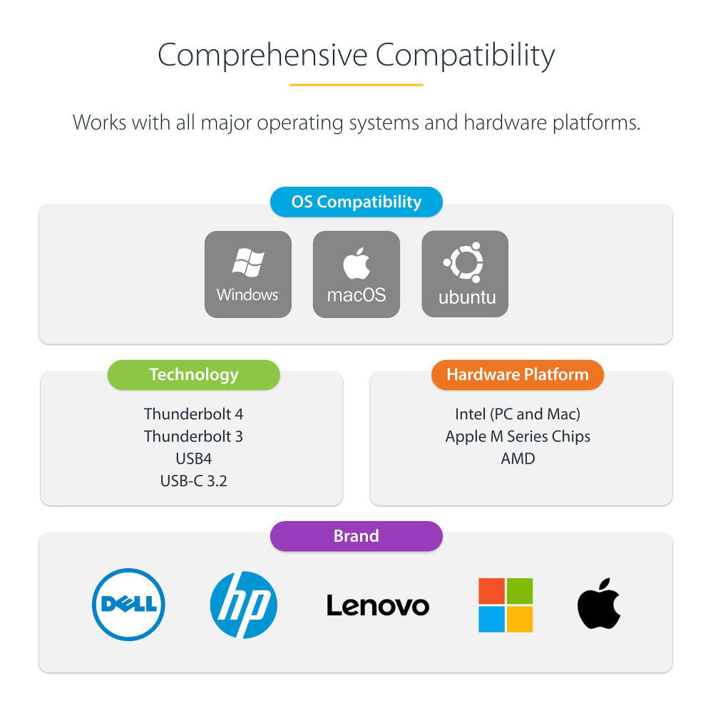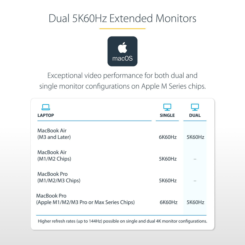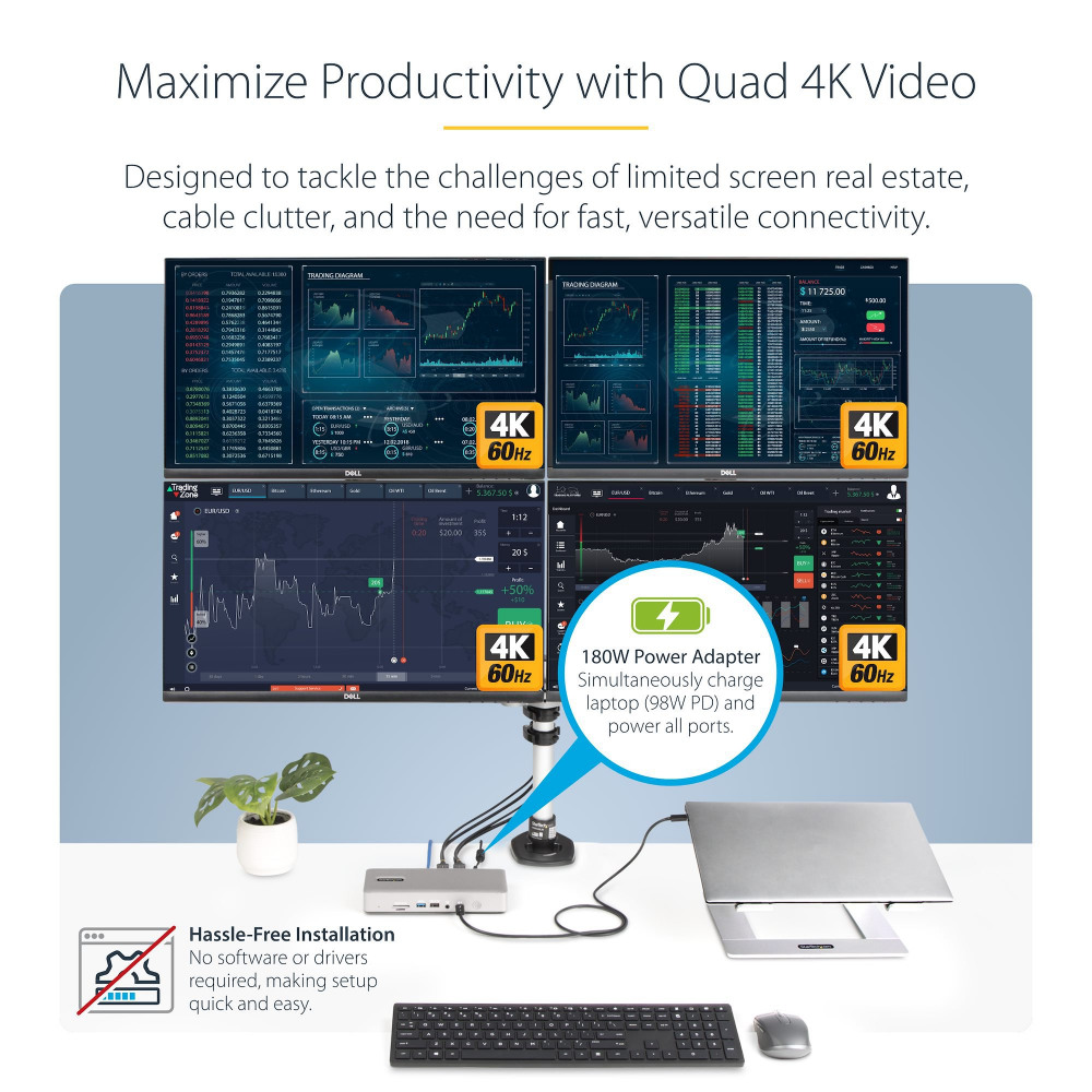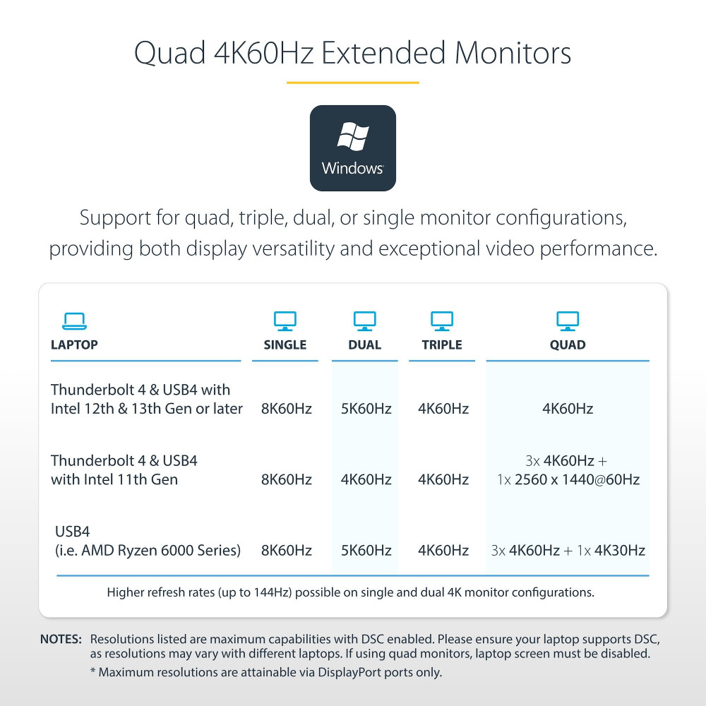 - COMPATIBILITY: Supports Windows and macOS; Works with Thunderbolt 4/USB4 laptops; Quad display on Windows laptops; Dual display on MacBook Pro (Apple M1/M2/M3 Max & Pro); Single display on MacBook Air